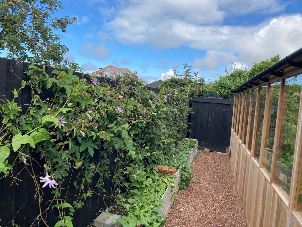 If so then this one is for you. After creating a long raised bed behind the new greenhouse and refreshing the raised bed at the opposite side of the garden we planted almost hardy passionflowers in both. We stapled up curtains of fleece over each in November.