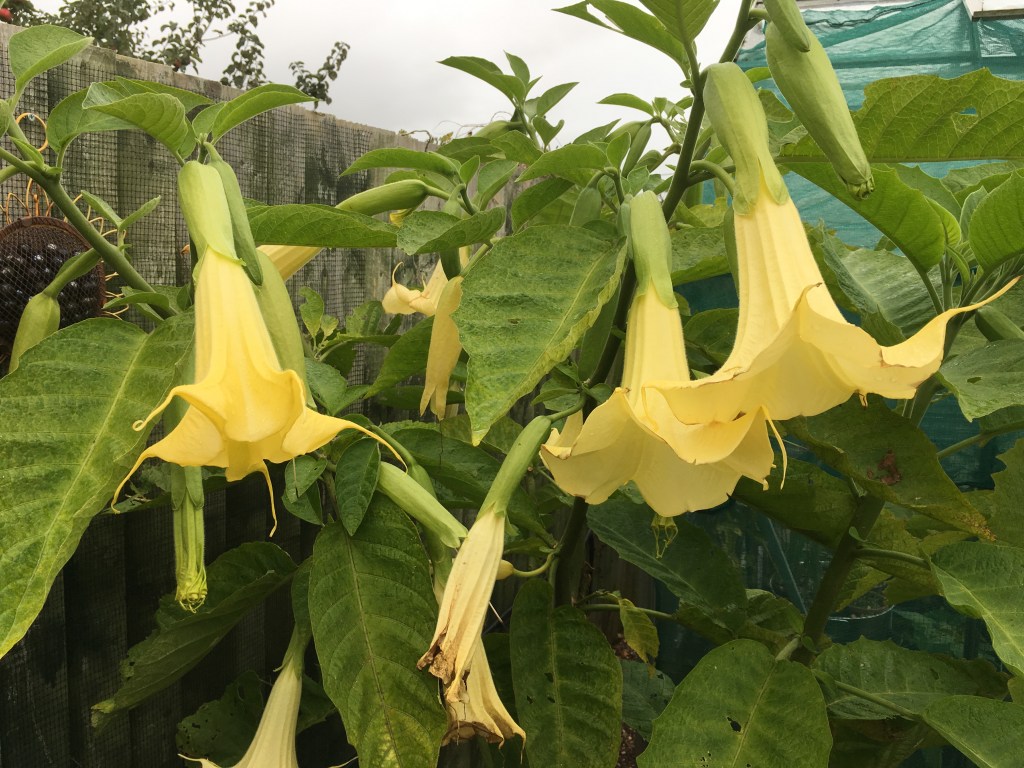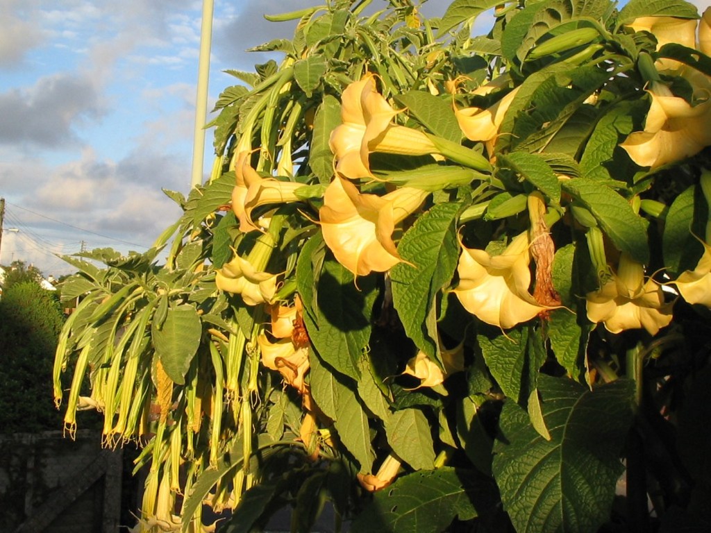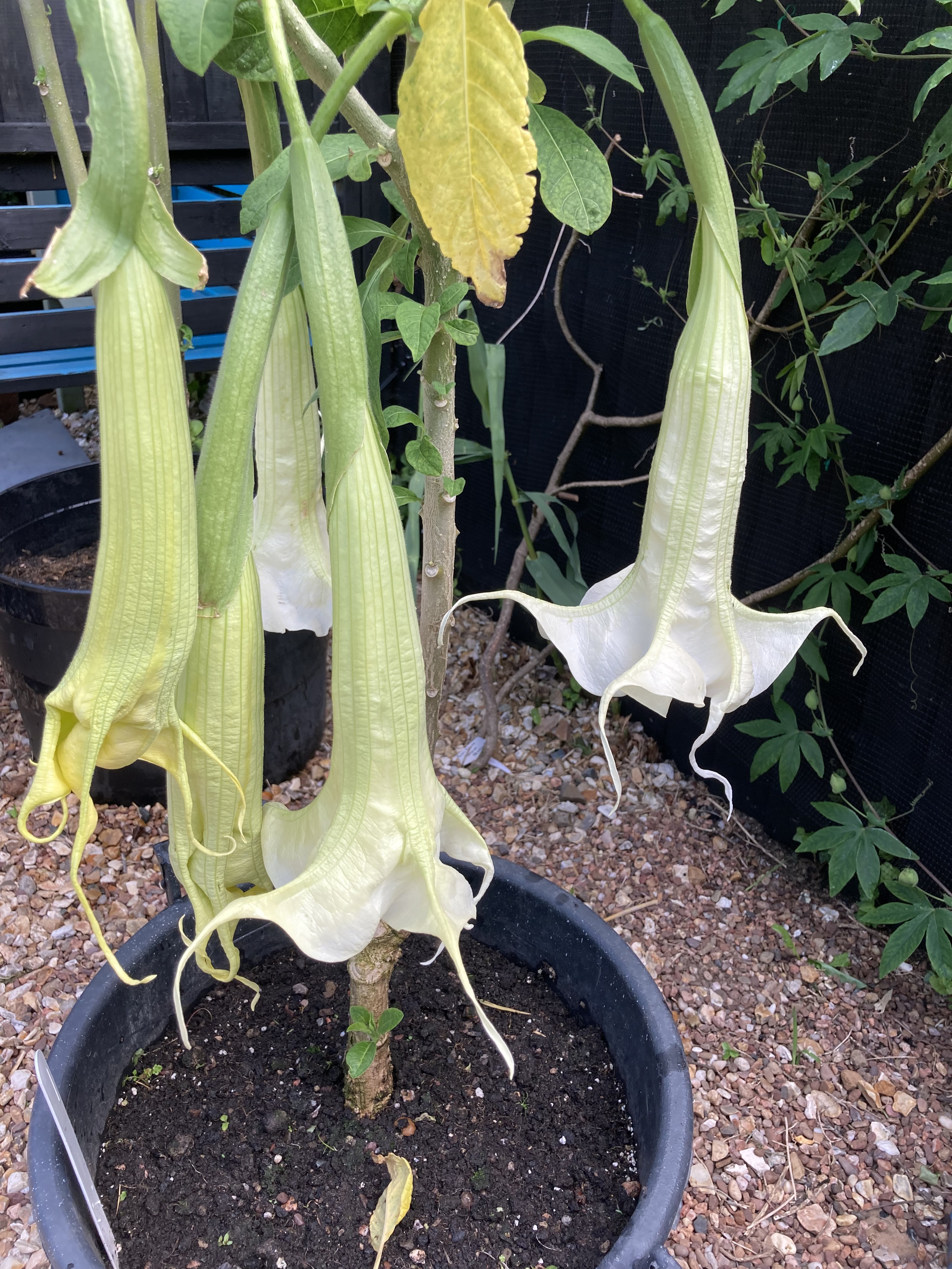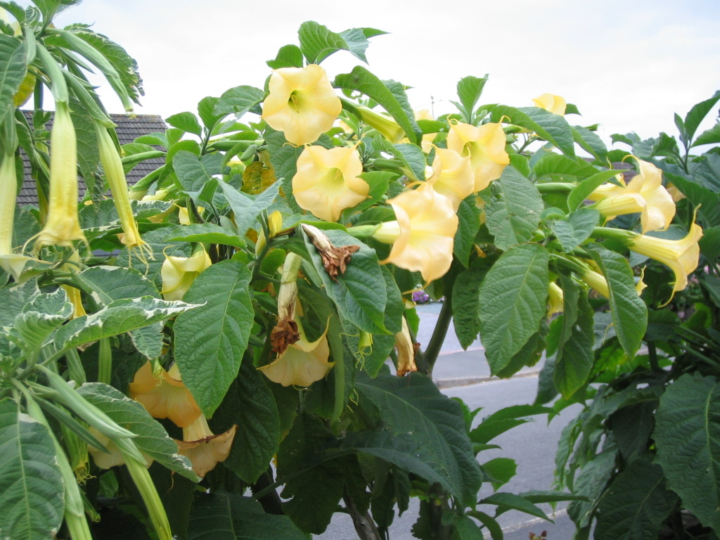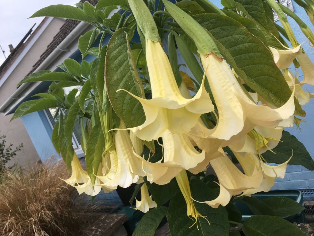 To make brugmansias grow as well as these, from March to November feed them high potash (e.g. tomato feed in red bottles) every time you water which could be every day in high summer$ (weaker solution than suggested on the container to keep your bank manager happy)!