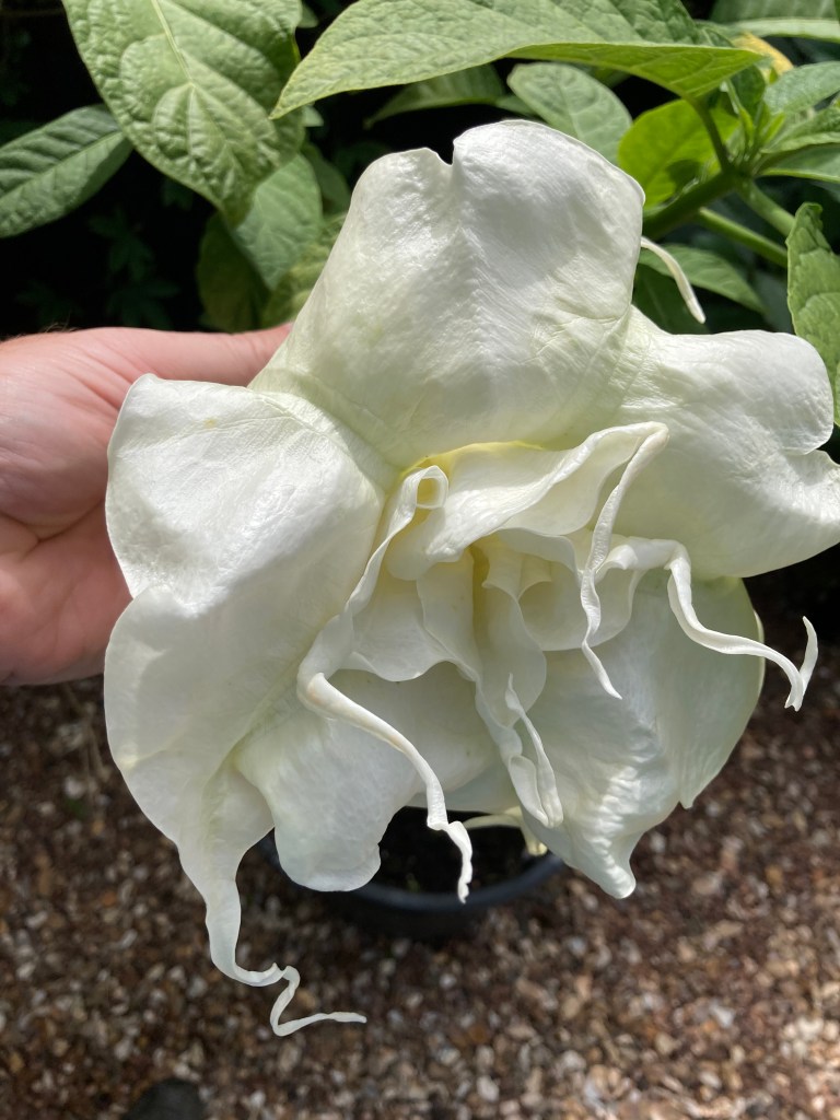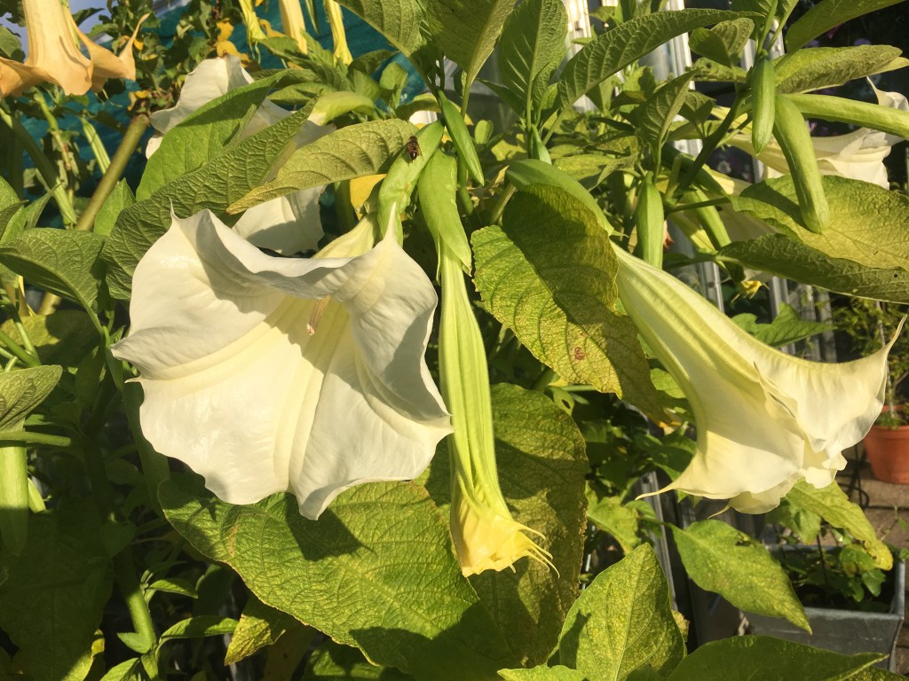 Brugmansia aurea (form from Eastgrove Cottage Garden). To my mind this one has the best evening scent of all. Distinctive of aurea is the outward facing flowers, whereas on most they hang straight down. This came to us as ‘Grand Marnier’ and we have seen a huge variety of brugmansias so labelled. We do also have the correct one in our mini collection (see below).Brugmansia ‘Grand Marnier’ This is the real deal and very lovely it is too, good robust and free flowering plant with a great scent.This is Brugmansia ‘Sunset’ a few years ago showing just how free flowering they can be if fed properly. It is also the case that a bigger pot gives you a bigger plant. These are in the ground via raised bed.Brugmansia ‘Langenbuscher Garten’ an extraordinary hybrid we aquired from Jon Kelf, a not to be missed selfie opportunity for our visitorsA close up of Brugmansia ‘Langenbuscher Garten’ flowerBrugmansia ‘Joli’ . This one is more delicate in form and colour and has a fine scent. A top plant, it’s been describes as ‘a ballet dancer among rugby players’Brugmansia ‘Canary Bird’ a good strong colour and great scent. Very similar to ‘Gelber Reise’Brugmansia ‘Gelber Reise’ A strong grower, good scent and free flowering, similar to Canary Bird (pictures taken in different light!)Brugmansia suaveolens, a species type with a much spicier kind of scent. One of the hardier sorts‘Purple Passion’ (possibly!)Brugmansia ‘Knightii’ – possibly
