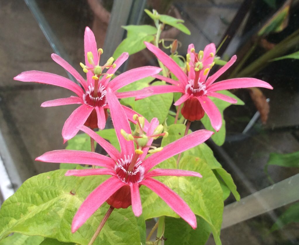 While some Passion Flowers are very tender and struggle with winter temperatures below 10°C there are a great many of very dramatic ones which will be perfectly happy with a minimum of 5°C and some which will take down to zero. If the cold is for a short period it is surprising what can make it through. Our P. racemosa ‘Buzios’ which needs a minimum of 7°C according to the books survived a greenhouse broken pane disaster on a very cold night and survived a drop to -9°C according to the thermometer. So they can surprise you. None of the following are likey to survive outside even in our mild estuary location on the North Devon coast. However, with the following set, we find that it is possible to bed them out for the summer, then dig them up, pot them up in large (10 to 20 litre) pots and return to the greenhouse for the winter. Although passion flowers planted outside send their roots down very deep And it becomes difficult to move them, this only happens in the second season.