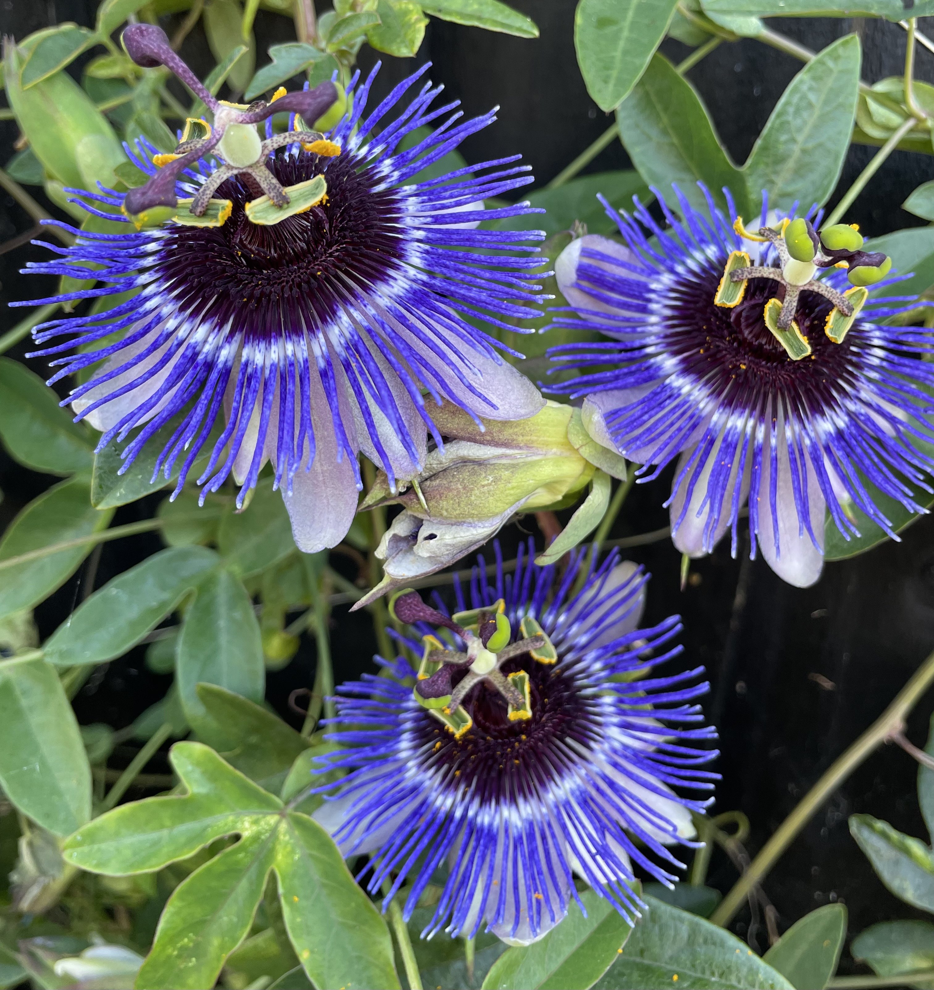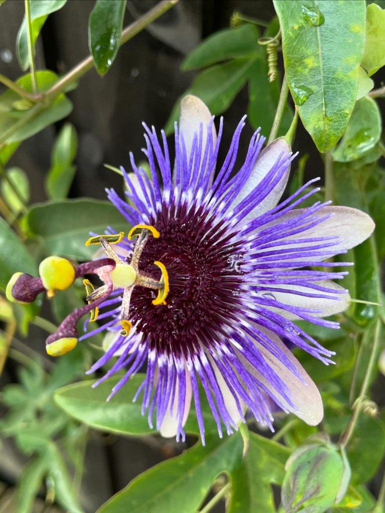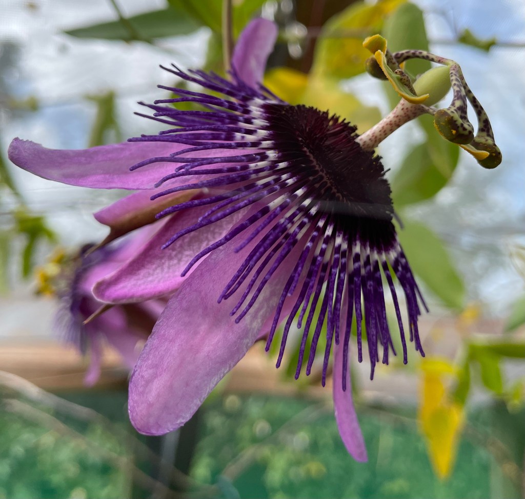 Passiflora ‘Vivacious Velvet’ is a cross we made in 2023. It is P. amethystina ‘Domingo Martins’ x P. caerulea. Unfortunately we lost the P. amethystina but the offspring is delightful. It is not dissimilar to P. ‘Purple Haze’ and P. ‘Purple Rain’. We are currently testing it for hardiness.