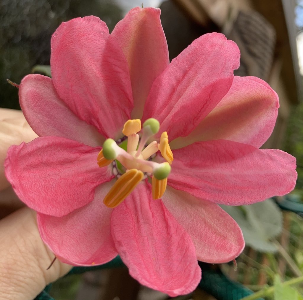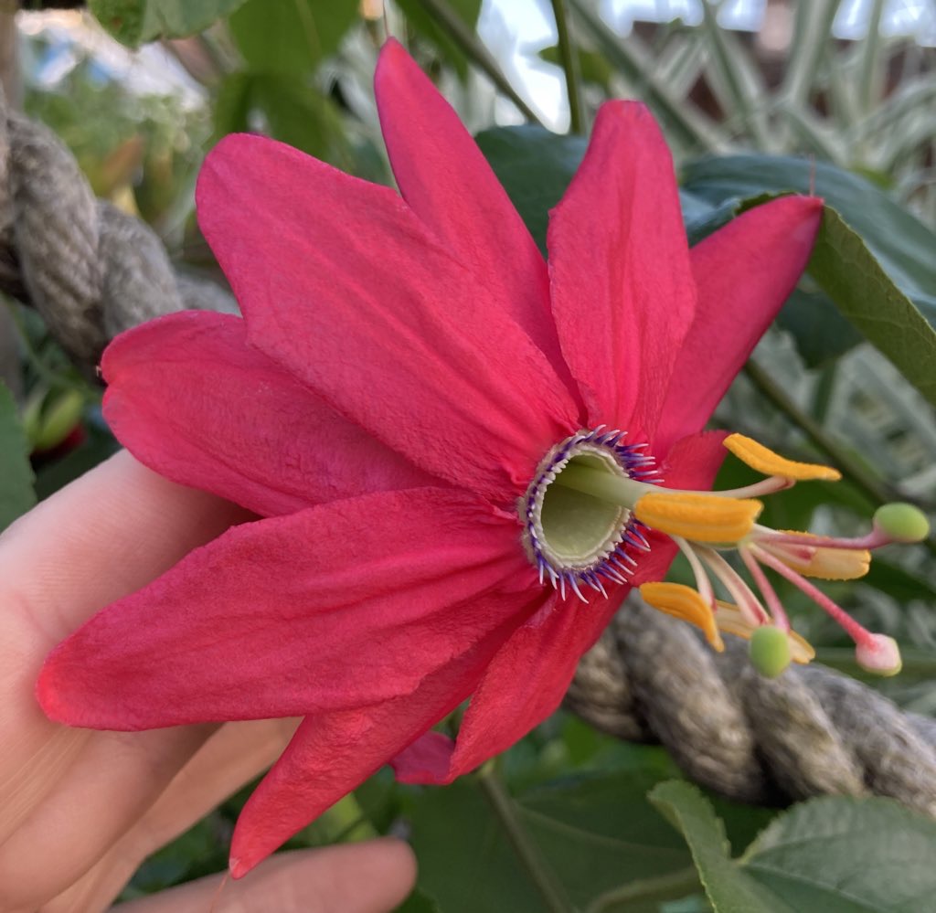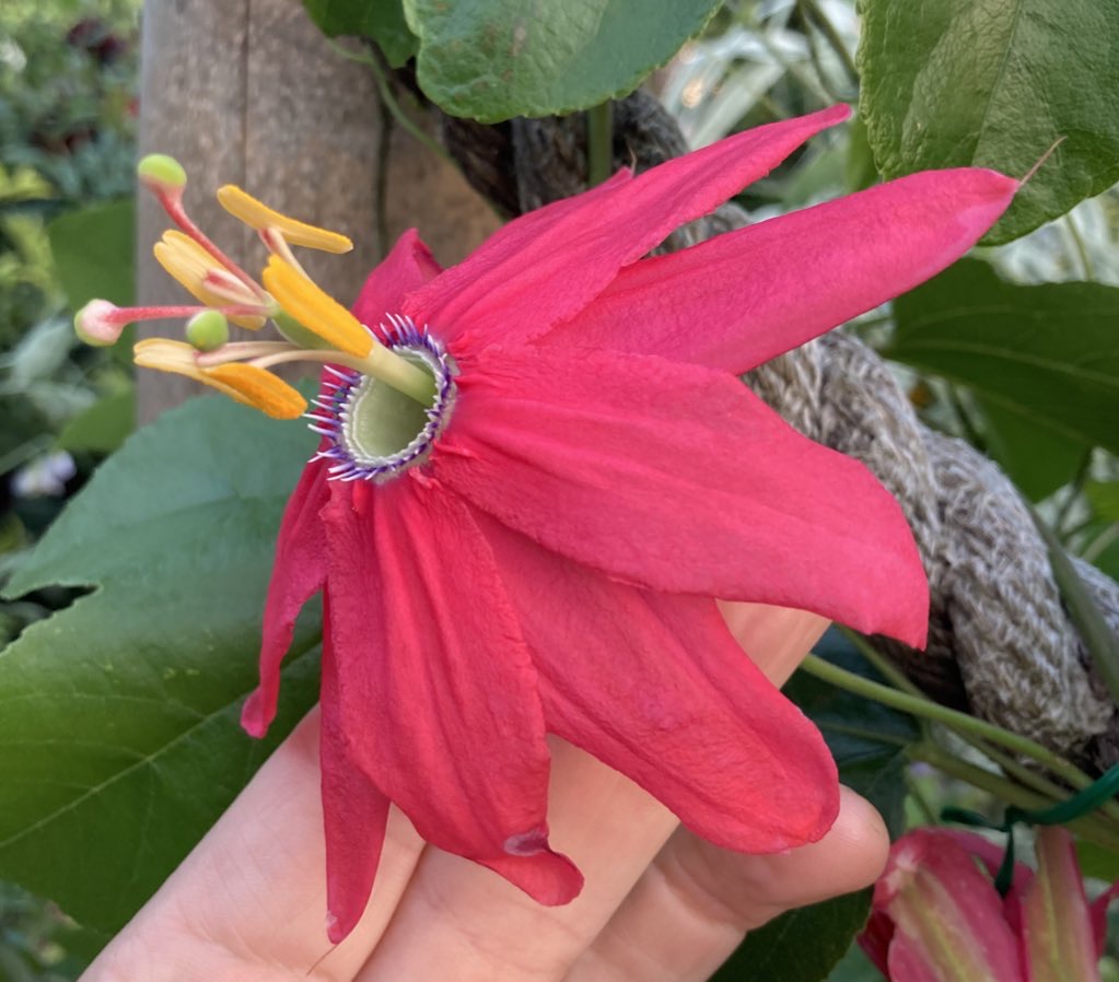 The tacsonias have at various times been a separate species, or made a supersection within passiflora (which is where they are now) they are both fascinating and wonderful because they are pollinated by hummingbirds, have big flowers and have wonderful colours. They also produce edible fruit, what more could you want (other than a scent which they don’t have, but that’s just being greedy)?