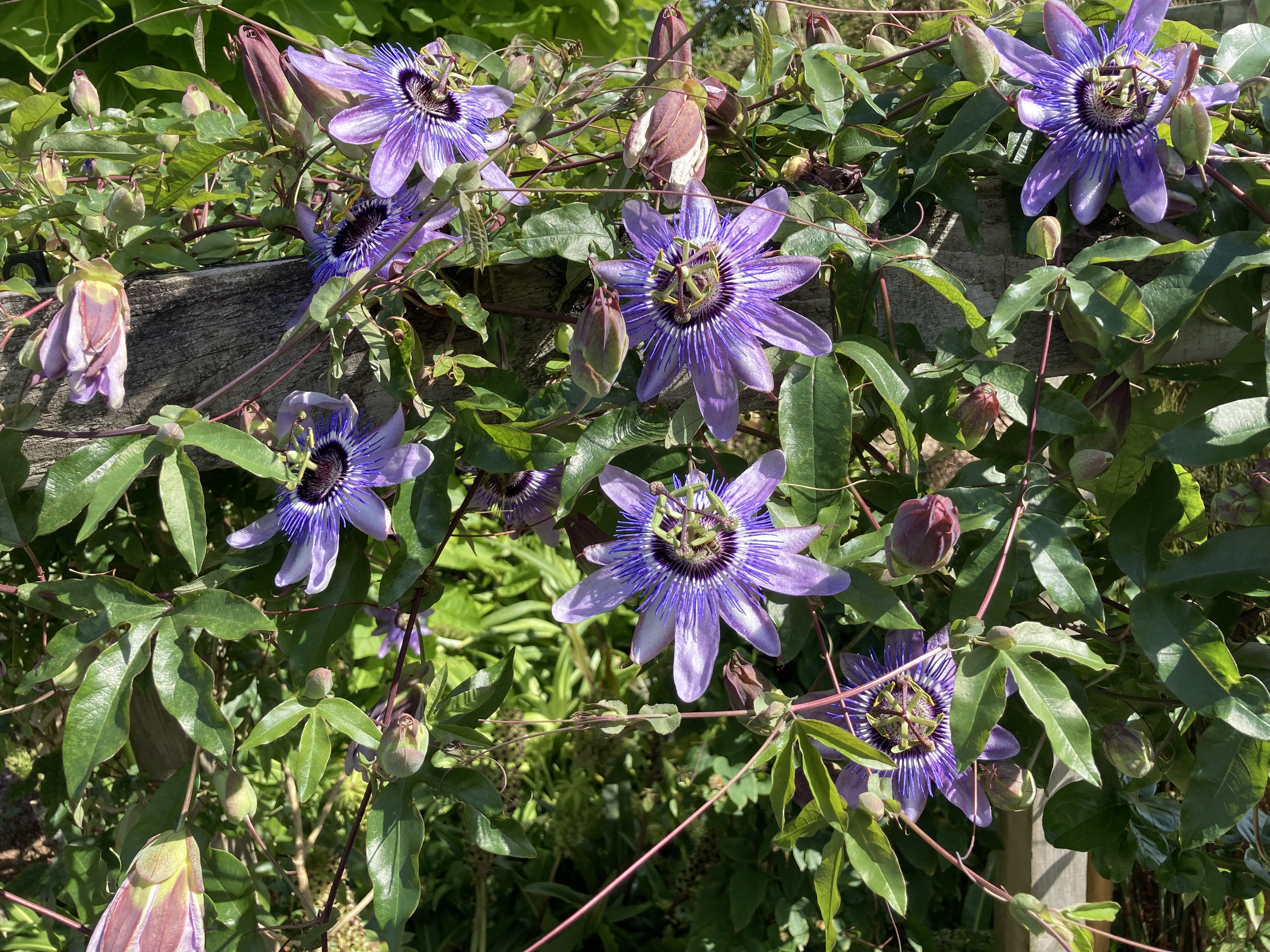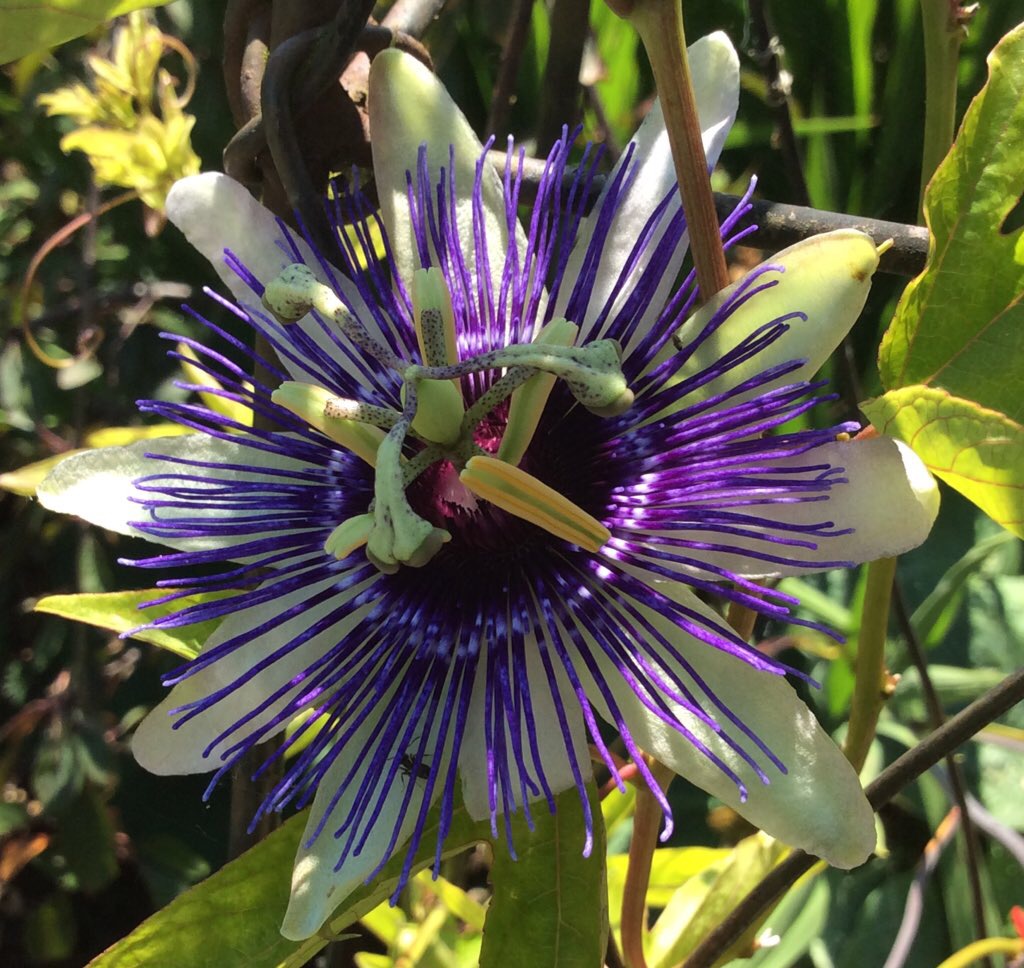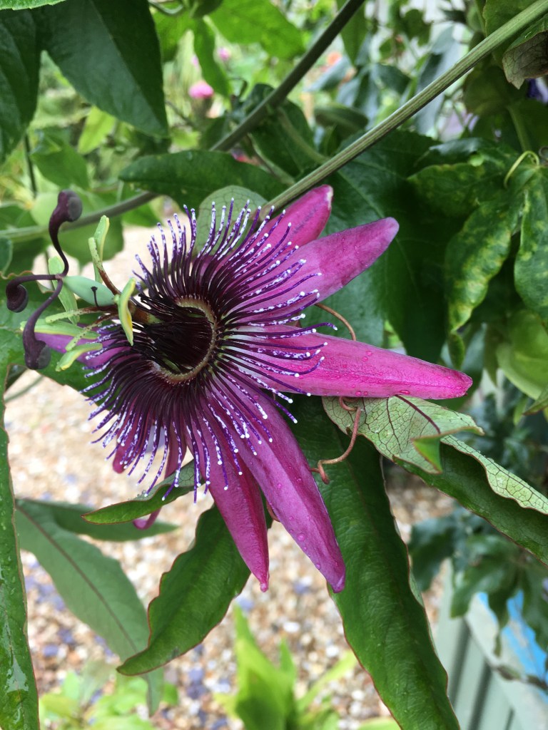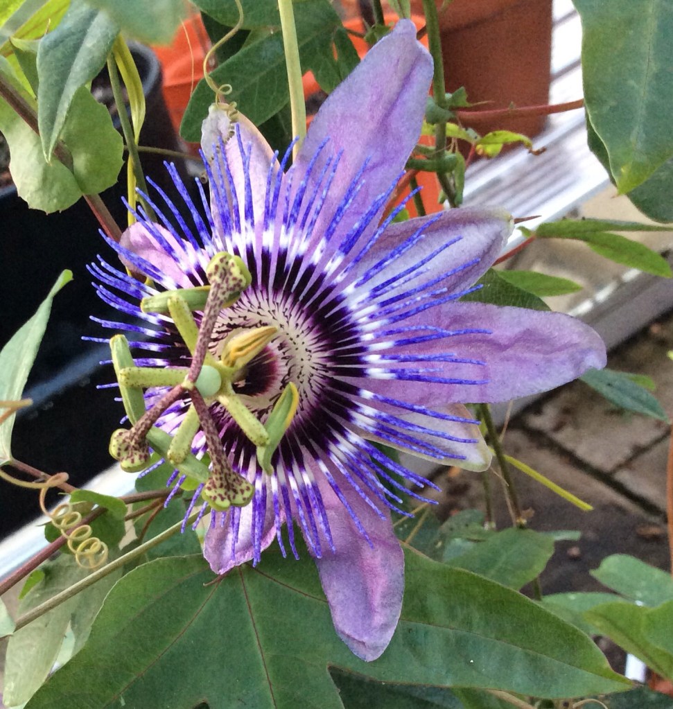 Passiflora x kewensis ‘Amethyst’ (or just P. ‘Amethyst’ to its friends): is a lovely coloured and free flowing hybrid (often confused with P. ‘Lavender Lady’ and frequently labelled amethystina, both of which are separate plants). It is hardy down to about -8 or so if allowed to get its roots deep in the first year and given a sheltered spot. The x kewensis is the result of recent research and it had to take the name from a very lovely hybrid now called ‘Kew Gardens’. The rules of plant naming are simple in principle but can be a tad confusing (think of them as being a combination the offside and away goals rules in football). Easiest perhaps to just refer to this as Passiflora ‘Amethyst’
