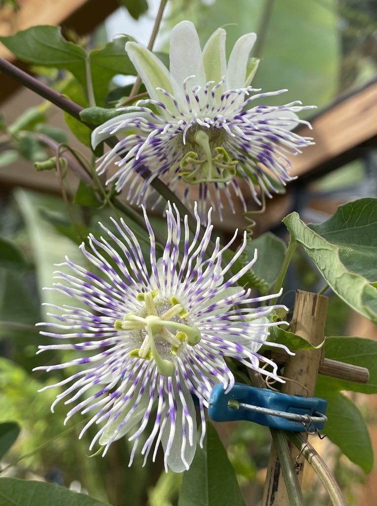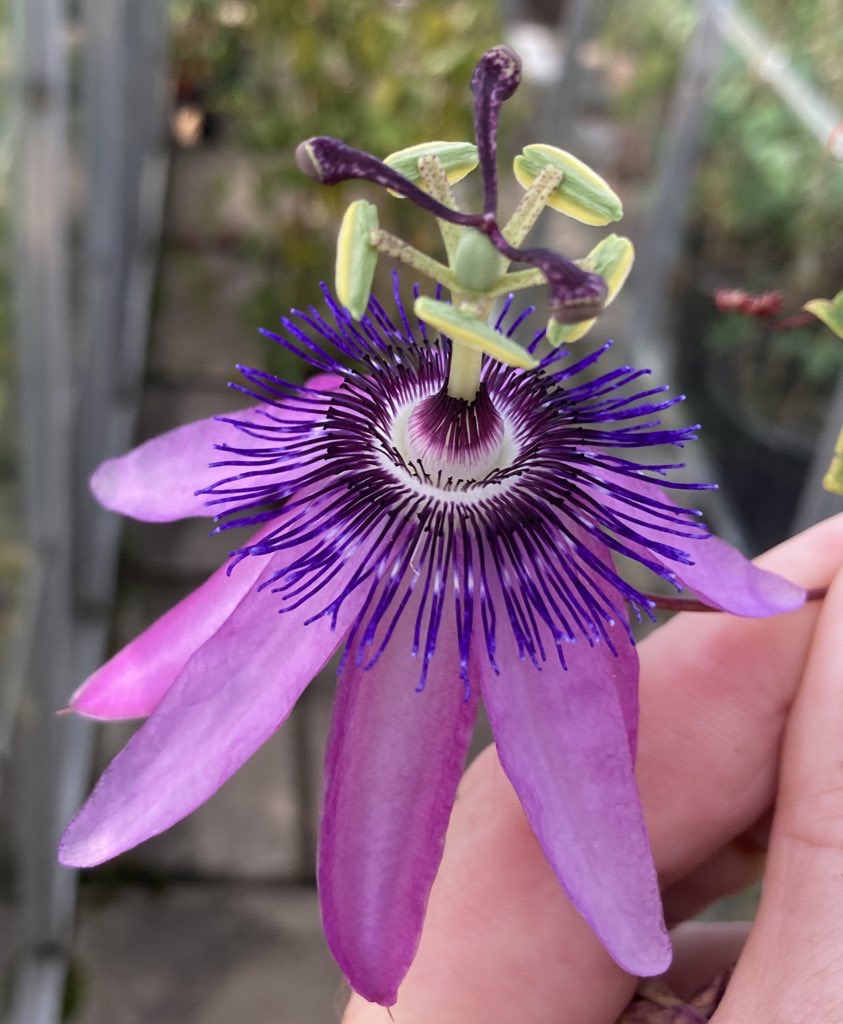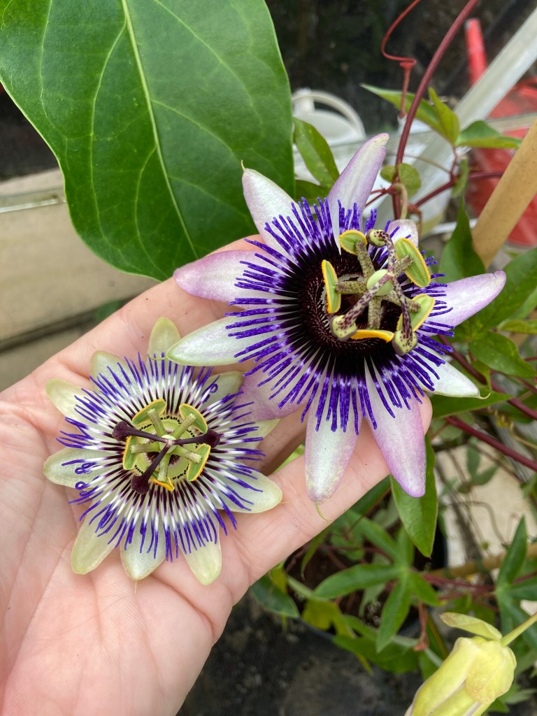 Passiflora tucumanensis This is a quite small flowered, pretty and lightly scented one. Allegedly hardy to -10 but we use it to scramble through the greenhouse roof. I will be taking cuttings and testing it for hardiness in 2026.