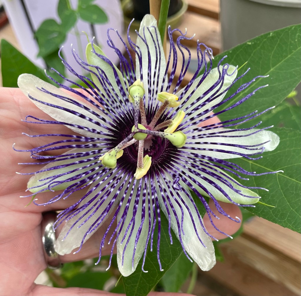 Passiflora ‘Damsel’s Delight’ is another of Myles’s polyploid hybrids. All 3 featured here are quite complex and include P. caerulea in their parentage. They are hardy, free flowering, robust and vigorous. They are the result of a lot of selection and testing and are some of the best hybrids currently on the market. Highly recommended.