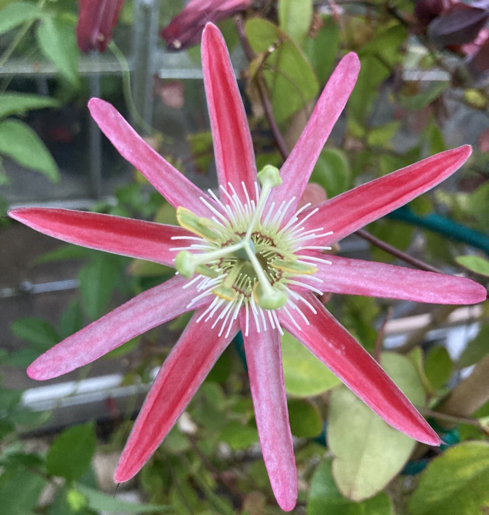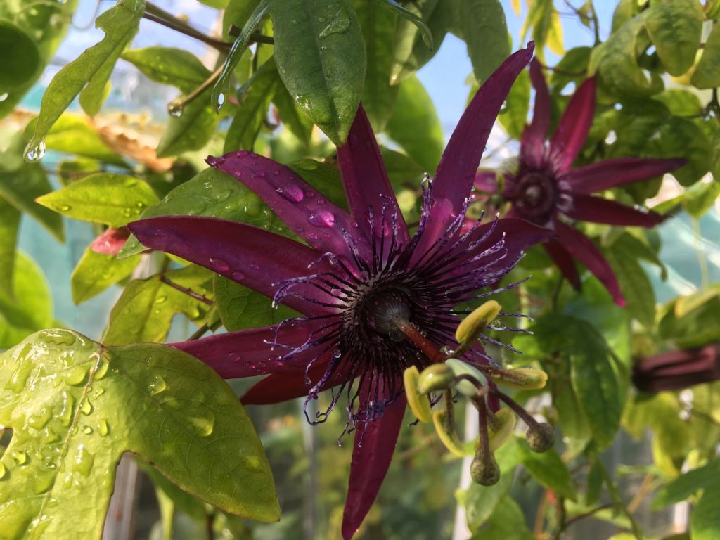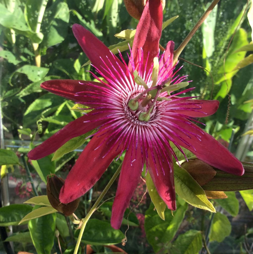 Passiflora ‘Pura Vida’ was sold a lot in the 1990s and appeared on the market again a dozen or so years ago (though those turned out to be x violacea). The real deal is lovely and free flowering. It is a slightly complicated hybrid (Basically P. Amethyst x P. racemosa which means in full it is (P. kermesina x P. caerulea) x P. racemosa) and was the starting point for the breeding of P. ‘Crimson Tears’, one of the most extraordinary, most complex (involves 5 species crossed) most beautiful and most temperamental plants I have grown. which also gives you one of those ‘invite the neighbours round days when it flowers’)