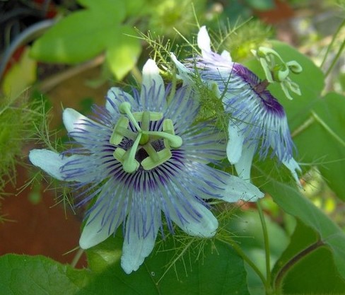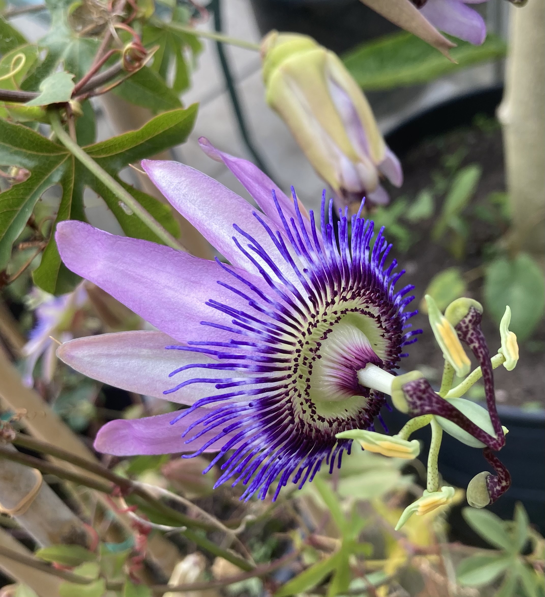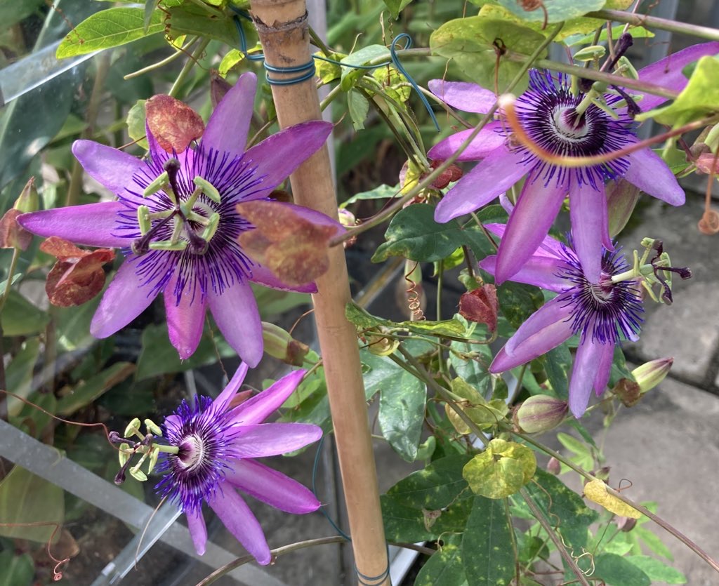 Passiflora x kewensis ‘Amethyst’ (or just P. ‘Amethyst’ to its friends): This is a lovely coloured and free flowing hybrid (often confused with P. ‘Lavender Lady’ and frequently labelled amethystina, both of which are separate plants). It is hardy down to about -8 or so if allowed to get its roots deep in the first year and given a sheltered spot. The x kewensis is the result of recent research and it had to take the name from a very lovely hybrid now called ‘Kew Gardens’. The rules of plant naming are simple in principle but can be a tad confusing. Easiest perhaps to just refer to this as Passiflora ‘Amethyst’.