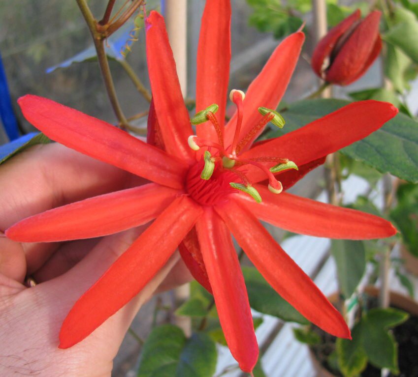 Passiflora ‘Michael’ is a hybrid of P. vitifolia with P. caerulea. The former is very tender so crossing it with P. caerulea has created a plant that is less fussy. The price paid for this is that the scarlet flowers of vitifolia have turned a duller brick red. However they are big and the plant robust so a great one to have. I have been experimenting with grafting P. vitifolia to P. caerulea rootstocks (fungal disease of the roots is what makes these so difficult to overwinter) this year so watch this space! – Breeder: M G Van der Steeg