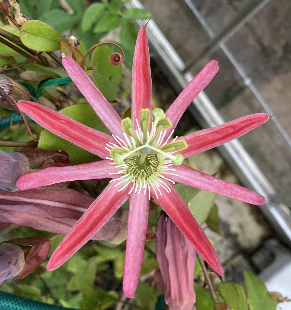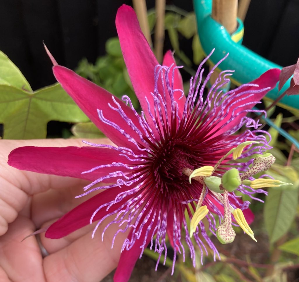 Passiflora ‘Monika Fischer’ is a triploid hybrid. Wonderful colouring. I find it a bit tricky to get going well, but it’s well worth the effort. Breeder: Dr Roland Fischer