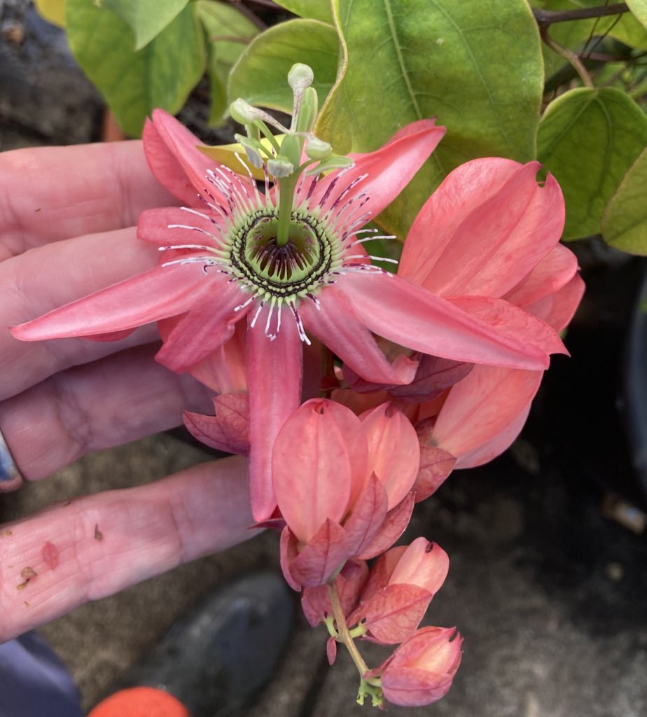Passiflora ‘Piresae‘ is a hybrid crossing P. quadrifaria with P. vitifolia to create this beauty. However it is even harder to overwinter than P. vitifolia and I don’t have one to graft onto hardier rootstock. On the wishlist, and one to graft on to a P. caerulea rootstock to help over wintering) – Breeder: John VanderPlank