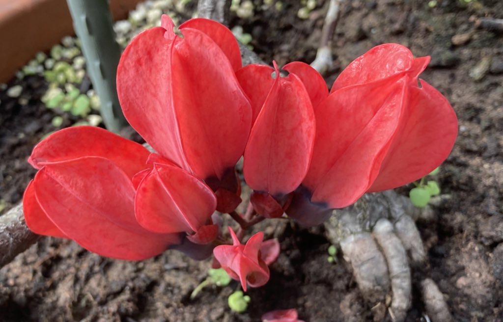 Passiflora phoenicia is similar to the better know P. alata. These square stemmed species and hybrids (including P. quadrangularis – though most that you buy under that name are hybrids with alata) are dramatic and heavily scented. I have had and lost at least half a dozen different ones. I rate P. phoenicia as the best of the bunch (and we still have it!)